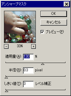 まずはアンシャープマスクでチョットきつめでハッキリさせておきましょう。